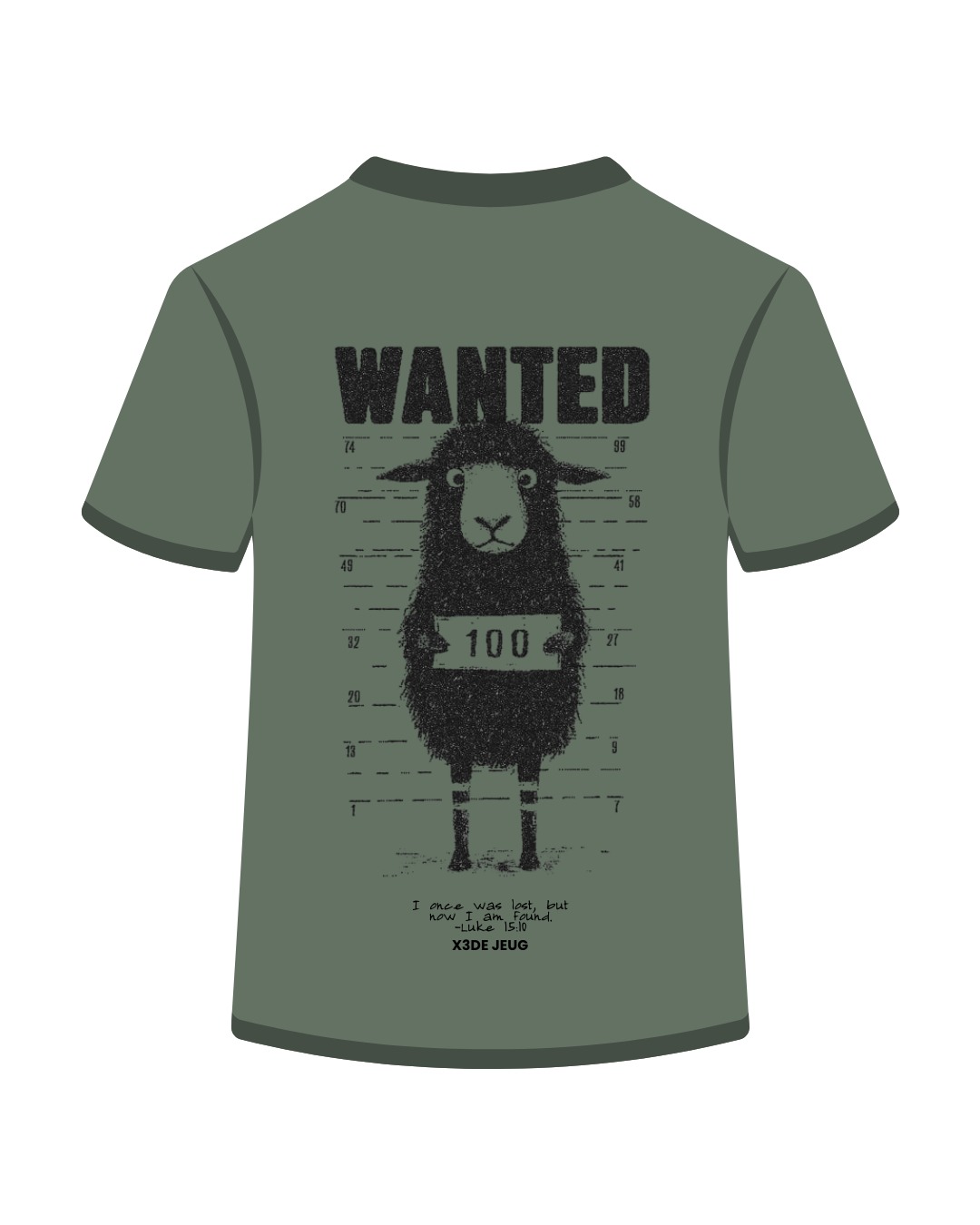 A premium, camp-ready tee with a bold message and a clean, minimal front. The back features a distressed “WANTED” sheep “mugshot” design with “100” detail and a faith-inspired line from Luke 15:10 — built to be worn proudly at camp and long after.